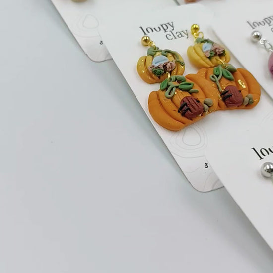 A small portal to an enchanted world. These earrings are not just simple accessories, but micro-sculptures that seem to have come out of a fairy tale. Each pumpkin is handcrafted to become a tiny fairy dwelling, complete with little doors, windows, and flowering vines that climb the surface. The crafting requires hours of precision to capture every vein and botanical detail in polymer clay. Wearing them means carrying a touch of forest magic with you, with the assurance of a one-of-a-kind piece in the world, incredibly lightweight and hypoallergenic.