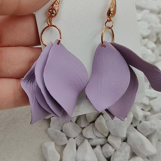 Inspired by the rebirth of secret gardens, the "Spring Dreams" earrings blend the shine of warm metals with the sculptural softness of clay. In this version, the cascade of petals in polymer clay — hand-shaped in a dreamy shade of purple — is supported by precious bases that enhance their elegance.