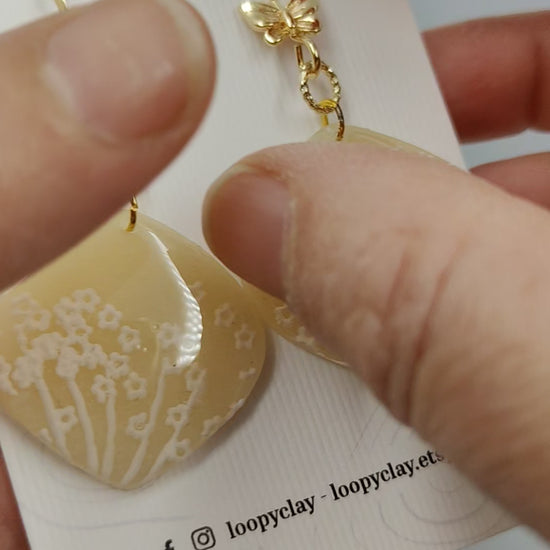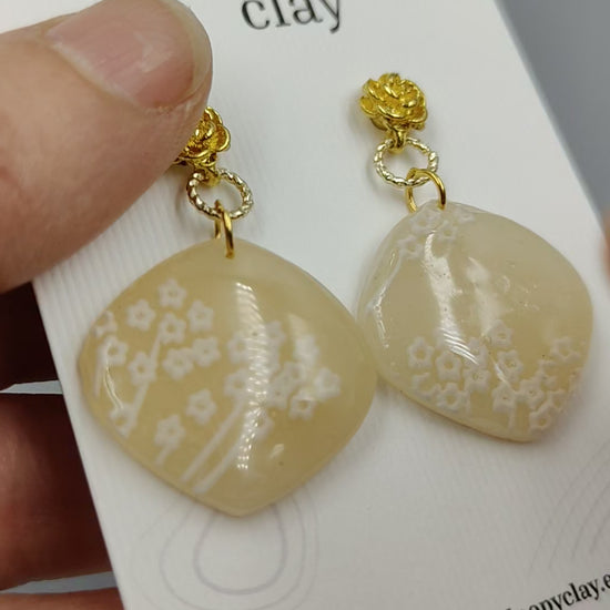 The refinement of bygone times and artisanal design meet in the line Antique Silk Embroidery. These dangling earrings, part of the Dreamy Nature collection, are made with a base of polymer clay in warm sand and nude tones. The finish is semi-transparent and glossy, designed to evoke the precious brilliance of vintage glass, giving the jewel a unique chromatic depth.